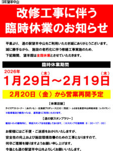 平素より、道の駅望羊中山をご利用いただき誠にありがとうございます。 誠に勝手ながら、施設の老朽化に伴う修繕工事実施のため、下記期間は全館休業とさせていただきます。 ■ 休業期間 2026年1月29日(木)~2月19日(木 […]